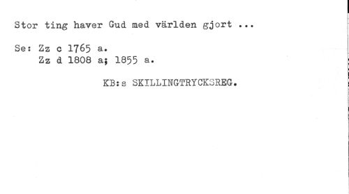 //// I //// Stor ting haver Gud med världen gjort ... t //// l i //// Se: Zz c 1765 a. //// Zz d 1808 a; 1855 a. 1 //// KB:s SKILLINGTRYCKSREG. \ //// | //// 1 i //// i ////