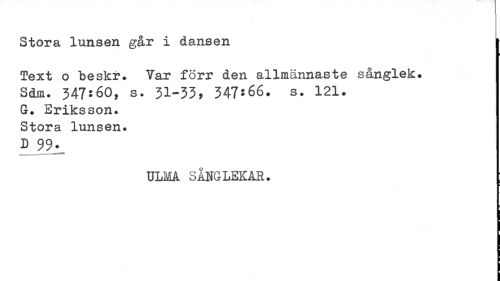 //// Stora lunsen går i dansen //// Text o beskr. Var förr den allmännaste sånglek. //// Sdm. 347^60, s? 31-33» 347*66. s. 121. //// G. Eriksson. Stora lunsen. //// D 99. //// ULMA SÅNGLEKAR. ////