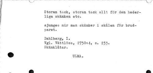 //// * . . . .. ~ • //// Storan tack, storan tack allt för den hederliga skänken etc. //// » //// sjunges när man skänker i skålen för brudparet. //// Dahlberg, I. //// Ygl. Vättlösa, 2750:4, s. 253. Skänklåtar. //// ® TJLMA. ////