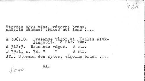 //// Vi fe //// I //// Stormen hörs vina,..vågorna brusa, snovita skummet vrakes mot land ... //// A 306:10. Brusande vågor^el., Kalles älsklingsbit. 8 str. kom. //// Å 312:3* Brusande vågor. 8 str# B 79:1, s. 74. " " 8 str. //// Jfr. Stormen den ryter, vågorna brusa ... //// RÅ. | ////