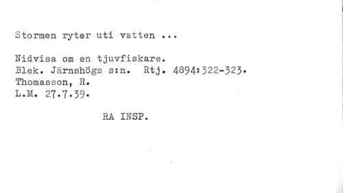 //// Stormen ryter uti vatten //// Nidvisa om en tjuvfiskare. //// Blek. Järnshögs s:n. Rtj. 4894*322-323- //// Thomasson, R. //// L.M. 27.7.39- //// Rå IISP. ////