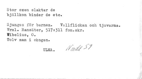 //// Stor oxen slaktar de bjällkon binder de etc. //// Sjunges för barnen. Tallflickan och tjuvarna. Vrml. Ransäter, 517:311 fon.skr. Wibelius, 0. Tolv man i skogen. //// ULMÅ. //// " I \< //// ___ ___J ////