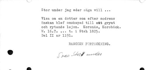 //// Stor under jag eder säga vill ... //// Visa om en dotter som efter modrens önskan blef omskapad till ett grymt och rytande lejon. Korsnäs, Korsbäck. W. 16.7. ... t. i Stsh 1825. Del II nr 1191. //// RANCKEN FÖRTECKNING. //// ^ ////