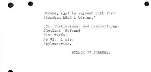 //// Streke, kjyt ån skynnan däkk fort Storskan känk' i "början. ' //// Jfr. förklaringar med översättning. //// Jämtland Refsund //// Olof Tirén. //// Nr 92. 1 str. //// Spelmansvisa. //// DYBECK SV FOLKMEL. ////