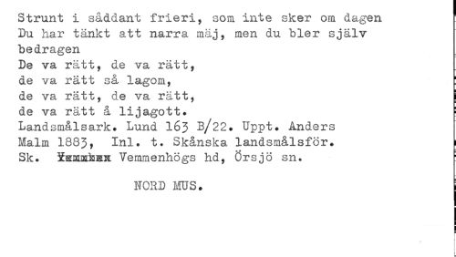 //// Strunt i såd&ant frieri, som inte sker om dagen Du har tänkt att narra maj, men du bler själv bedragen //// De va rätt, de va rätt, //// de va rätt så lagom, ! //// de va rätt, de va rätt, I //// de va rätt å lijagott. 1 //// Landsmålsark. Lund 163 B/22. Uppt# Anders Malm 1883» Inl. t. Skånska landsmålsför* 1 //// Sk. Sssttränu Vemmenhögs hd, örsjö sn. : //// NORD MUS. j ////