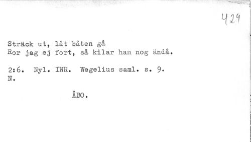 //// Htf //// i //// Sträck ut, låt båten gå //// Ror jag ej fort, så kilar han nog ändå. //// 2:6. Nyl. IHR. Wegelius saml. s. 9. H. //// ÅBO. ////