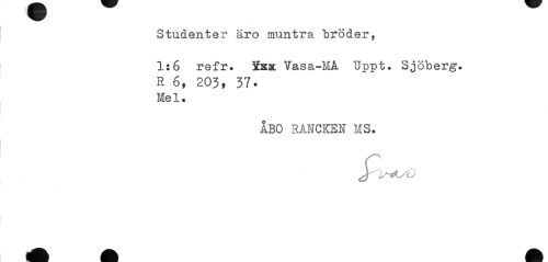 //// Studenter äro muntra bröder, //// 1:6 refr. 3£sa Vasa-MA Uppt. Sjöberg. //// R 6, 203, 37. //// Mel. //// ÅBO RÅNCKE3J MS. ////