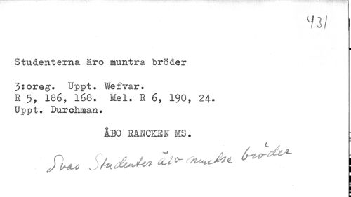 //// v3/ //// ¦ //// Studenterna äro muntra bröder //// 3:oreg* Uppt. Wefvar. R 5, 186, 168. Mel. R 6, 190, 24» //// Uppt. Durchman. //// ÅBO RANCKEJT MS. ; //// Jl*. Ja^ ***** j ////