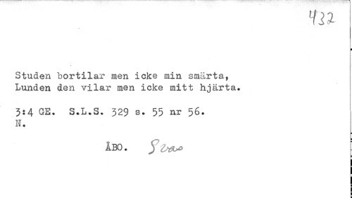 //// # //// i //// Studen bortilar men icke min smärta, Lunden den vilar men icke mitt hjärta. //// 3:4 GE. S.L.S. 329 s. 55 nr 56. N. //// ¦ //// ABO. j ¦ ////