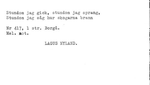 //// Stundom jag gick, stundom jag sprang, Stundom jag såg hur skogarna brann //// Nr 417, 1 str. Borgå. //// Mel. mot. | //// LAGUS NYLAND. //// i //// 1 ////