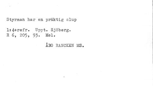 //// Styrman har en präktig slup //// l:4+refr. Uppt. Sjöberg. B 6, 205, 95» Mel. //// ÅBO HANCKEN MS. ////