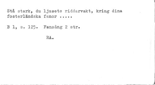 //// Stå stark, du ljusets riddarvakt, kring dina fosterländska fanor ... //// Bl, s. 125» Fansäng 2 str. //// RÅ. I ////