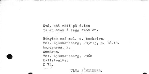 //// Stå, stå rätt på foten ta en sten å lägg emot en. //// Ringlek med mel. o. beskrivn. Yml. Ljusnarsberg, 2832:J, s. 16-18. Lagergren, E. Anmärkn. //// 7ml. Ljusnarsberg, 2868 Kallstenius. //// D 74. //// TT T T ,T A e A wn T T.-irr A T> ////