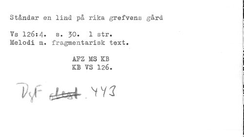 //// Ståndar en lind på rika grefvens gård ! //// ¦ //// Ys 126:4. s. 30. 1 str. Melodi ra. fragmentarisk text. //// u fl //// AFZ MS KB j //// KB VS 126. I //// i ////