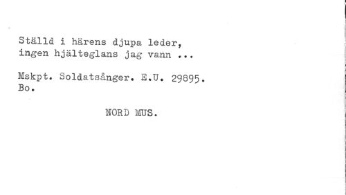 //// Ställd i härens djupa leder, //// ingen hjälteglans jag vann ... i //// i //// Mskpt. Soldatsånger. E.U. 29895. Bo. //// HORD MUS. //// ! //// i ] //// i ////