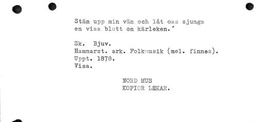 //// Stäm upp min vän och låt oss sjunga en visa blott om kärleken»' //// Sk. Bjuv. //// Hammarst. ark. Folkmusik (mel. finnes). //// Uppt. 1878. //// Visa. //// hord uns //// kopior lekar. ////