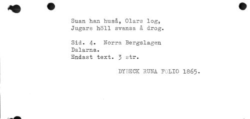 //// Suan han huså, Olars log, Jugars höll svansa å drog. //// Sid. 4. Norra Bergslagen Dalarna. //// Endast text. 3 str. //// DYBECK SUSA POLIO 1865. ////