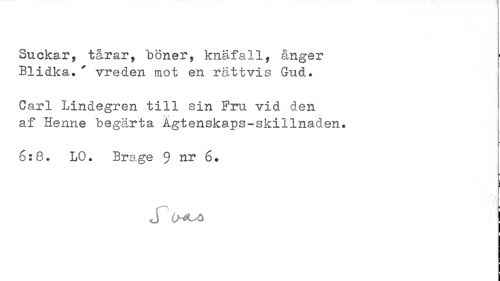 //// Suckar, tårar, "böner, knäfall, ånger f //// Blidka.' vreden mot en rättvis Gud. //// Carl Lindegren till sin Fru vid den //// af Henne begärta Ågt ensKaps- skillnaden. i //// 6:8. LO. Brage 9 nr 6. //// i ¦ //// ¦¦ i ¦»i //// J Lh^ö ////