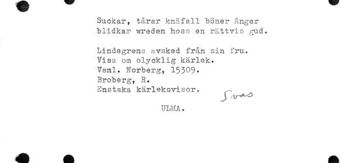 //// Suckar, tårar knäfall böner ånger blidkar wreden hoss en rättvis små. //// O //// Lindegrens avsked från sin fru. Yisa om olycklig kärlek. Vsml. Norberg, 15309* Broberg, B. Enstaka kärleksvisor. //// J //// ULMA. ////