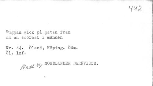 //// i //// Suggan gick på gatan fram mä en smörask i munnen //// Nr. 44. Öland, Köping. öSm. Öl. lmf. //// /, -/ L/u NORDLÄNDER BARNVISOR. //// /ifadZt ?7 //// i ////