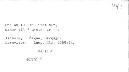 //// VY? //// Sullan lullan litet tar, mamma såt å nysta gar ••. //// Tidholm,*. Signe, Bergsjö. Barnvisor. Insp. Rtj. 8369*24* //// RA INSP. //// /1/tfidi 3 \ ////