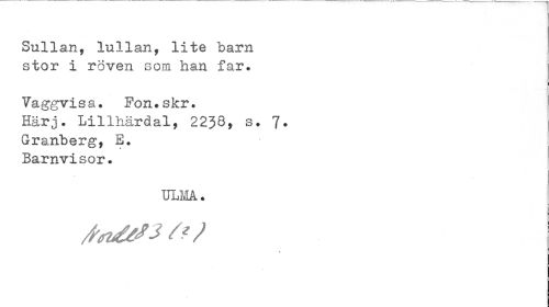 //// Sullan, lullan, lite "barn stor i röven som han far. //// Vaggvisa. Fon»skr. //// Härj. Lillhäråal, 2238, s. 7. //// Granberg, E. Barnvisor. //// ULMå. ////