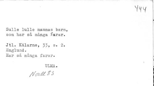 //// ¦ //// Sulle lulle mammas barn, som har så många farar. //// Jtl. Kälarne, 33? s* 2* //// Englund. //// Har så många farar. = //// i //// ULMÅ. ; //// /Ifcndl XI ////