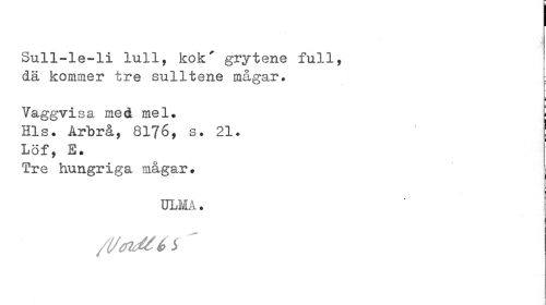 //// Sull-le-li lull, kokA grytene full, dä kommer tre sulltene mågar. //// i //// Vaggvisa med mel. [ //// Hls. Arbrå, 8176, s. 21. Lof, E. //// Tre hungriga mågar. //// ULMA. //// /(Jttottb S ' ////