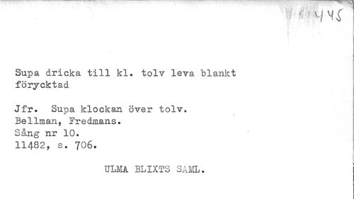 //// W- m ^i //// ti* '\J *., ¦. f //// % iv //// j //// ¦ //// Supa dricka till kl. tolv leva blankt förycktad //// Jfr. Supa klockan över tolv. //// * //// Be1Iman, Fre dmans. Sång nr 10. 11482, s. 706. //// ULMA BLIXTS 3AML. ////
