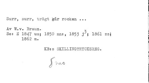 //// Surr, 3urr, trögt går rocken ... Av W.v. Braun. , //// Set E 1847 uu; 1850 nnt, I853 y-, 1861 zzj il //// 1862 m. ! //// KB: s SKILLI1TGTHYGKSHEG. //// I //// ¦ //// j) '| ////