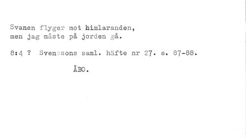 //// Svanen flyger mot himlaranden, men jag måste på jorden gå. //// 8:4 ? Svenssons saml. häfte nr 27• s. 87-88. //// i //// ÅBO. ////