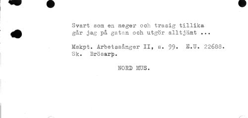 //// Svart som en neger och trasig tillika ^^ går jag på gatan och utgör alltjämt ... //// Msfcpt. Arbetssånger II, s. 99* E.V. 22688. Sk. Brösarp. //// NORD MUS. ////