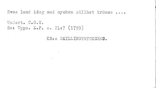 //// i //// / //// Svea. land idag med mycken sällhet krönes ... Undert. C.G.S. //// Se: Upps. Z.P. s. 21:7 (1799) //// KB: s SKILL IIIGTHTCKSRE®. //// - //// t //// [ ////