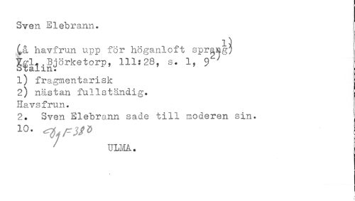 //// Sven Elebrann. //// (,å havfrun upp for höganloft sprang] ^l^^Björketorp, 111:28, s. 1, 9 //// 1) fragmentari sk //// 2) nästan fullständig. Havsfrun. //// 2. Sven Blebrann sade till moderen sin. //// ULMA. //// i ////