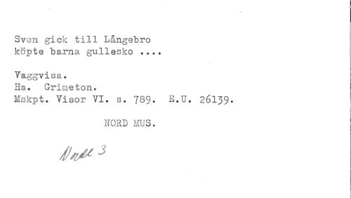//// Sven gick till Långebro köpte barna gullesko ... //// Vaggvisa. Ha. Griraeton. //// Mskpt. Visor VI. s. 789. E.U. 26139- //// HORD MUS. //// Jt/V* 3 ////