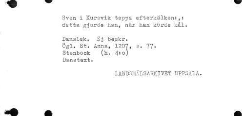 //// Sven i Kursvik tappa efterkälken:,: detta gjorde han, när han körde kål. //// Danslek. Ej beskr. //// Ögl. St. Anna, 1207, s. 77* //// Stenbock (h. 4*o) Danstext. //// LANDSMALSAHKIVET UPPSALA. ////