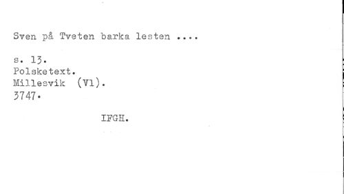 //// Sven. på Tveten barka lestert ... //// s. 1J. ; //// Polsketext. //// Millesvik (Vi). //// 3747- //// IFGH. //// / 1 ////