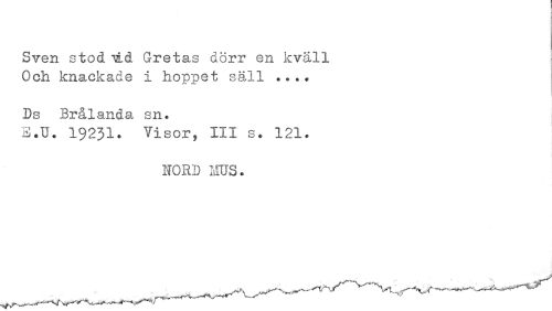 //// Sven stod Tid Gretas dörr en kväll Och knackade i hoppet säll ...» //// Ds Brålanda sn. //// E.U. 19231- Visor, III s. 121. //// NORD MUS. ////