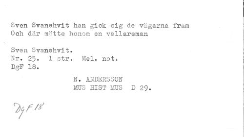 //// Sven Svanehvit han gick sig de vägarna fram Och där mötte honom en vallareman //// * //// Sven Svanehvit. //// Nr. 25» 1 str. Mel. not. //// DgF 18. //// N. ANDERSSON //// MUS HIST MUS D 29. //// % f ////