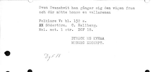 //// Svea Svanehvit han gångar sig den vägen fram och där mötte honom en vallareman //// Folklore Y: bl» 132 a. XX Södertörn. C, Hallberg. Mel. not. 1 str. DGF 18. //// DYBECK MS KVHAA MOBERG EXCERPT. ////