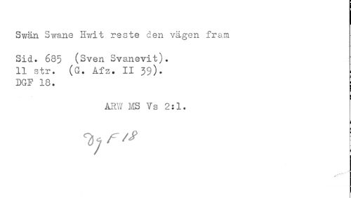 //// Swän Swane Hwit reste den vägen fram //// Sid. 635 (Sven Svanevit). 11 str. (G. Åfz. II 39). //// DGF 18. j //// ARW MS Vs 2:1. //// i ////