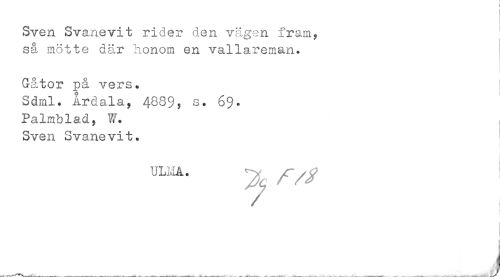 //// Sven Svanevit rider den vägen fram, så mötte där honom en vallareman. //// Gåtor på vers. i //// & i //// Sdml. Årdala, 4889, s. 69. //// Palmblad, W* , //// Sven Svanevit. //// ULMA. y I //// i //// ...__.„___j ////