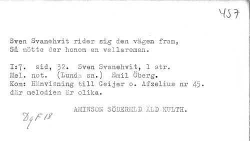 //// Sven Svanehvit rider sig den vägen fram, Så mötte der honom en vallareman. //// 1:7* sid, 32® Sven Svanehvit, 1 str. Mel. not. (Lunda sn.) Emil Öberg. Kom: Hänvisning till Geijer o. Afzelius nr 45* där melodien är olika. //// AMINSON SÖDEEMLD ALD KULTH. //// ^ F ////