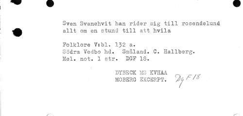 //// Sven Svanehvit han rider sig till rosendelund ^fc allt om en stund till att h/vila //// Folklore V:bl. 132 a. //// Södra Vedbo hd. Småland. C. Hallberg. Mel. not. 1 str. DGF 18. //// DYBECK MS KYHÅA MOBERG SXCERPT. Jj ^ ////