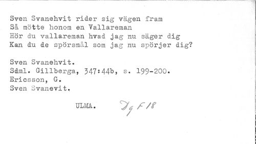 //// Sven Svanehvit rider sig vägen fram //// Så mötte honom en Tallareman //// Hör du vallareman hvad jag nu säger dig //// Kan du de spörsmål som jag nu spörjer dig? //// Sven Svanehvit» //// Sdml. Gillberga, 347*44^, s. 199-200» Ericsson, G. Sven Svanevit. //// ULM. % f/S" ////
