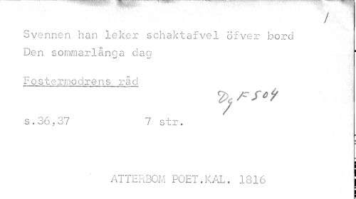 //// / //// Svennen han leker schaktafvel öfver bord //// Den somrnarlanq a g a q f //// w- //// Fostermodrens råd //// 7 //// s.36,37 7 str. //// ATTERBOM POET.KAL. 1816 ////