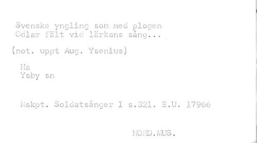//// ! //// Svenske yngling som med plogen Odlar fält vid lärkans sång... //// / //// (not. uppt Aug. Ysenius) //// T T ^ //// M o //// Jt l CA //// Ysby sn //// Mskpt. Soldatsånger I s.32i. H.U. 17966 //// NORD. IViUS, //// ¦i ////