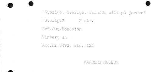 //// u m ™ ^ ^^^ //// iV v //// "Sverige, Sverige, framför allt på jorden11 "Sverige" 2 str. //// Ref.Aug.Bondeson Vinberg sn //// Acc.nr 3492, sid. 121 //// VARBERG MUSEUM ////