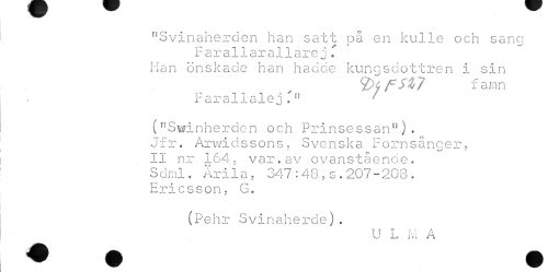 //// "Svinaherden han satt på en kulle och sang //// Farallarallarejf Han önskade han hadde kungsdottren i sin //// famn //// Farallale j ' //// ("Swinherden och Prinsessan"). Jfr. Arvidssons, Svenska Fornsåncer, II nr 164c var.av ovanstående. //// Sami. Årila, 347:48,s.207-208. Ericsson, G. //// (Pehr Svinaherde). //// U L M A ////