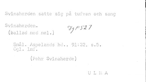 //// Svinaherden satte sig på tufvan och sang //// Svinaherden. cy f^yZ J //// (ballad med mel.) ' j //// S/nål. Aspelands hd . , 91: 32. s . 5 . //// T- * 1 ' //// Ogl. lmf. //// (Pehr Svinaherde) //// TIT T A U L ivi H ////